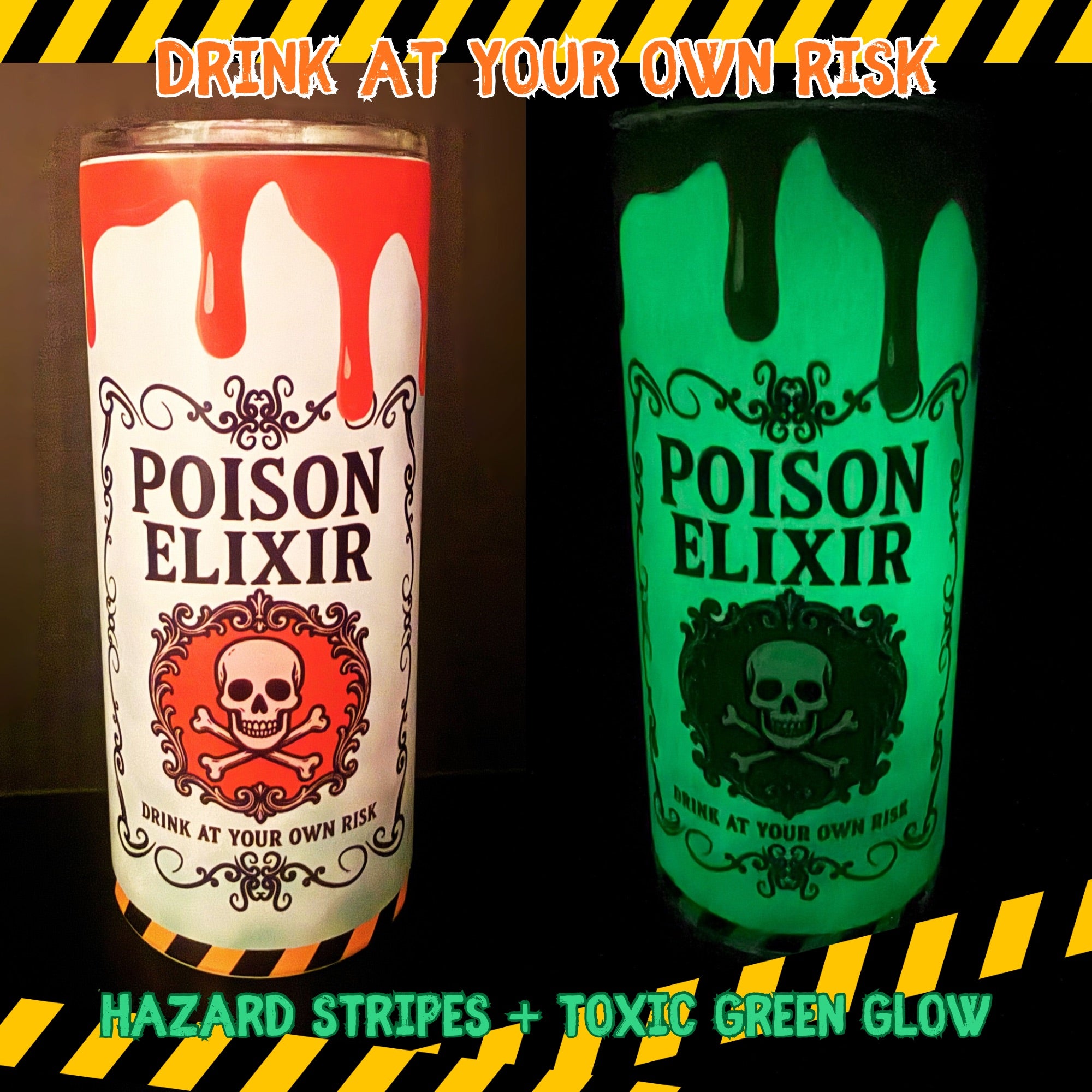 • Poison Elixir – toxic orange drip, hazard stripes, glowing skull