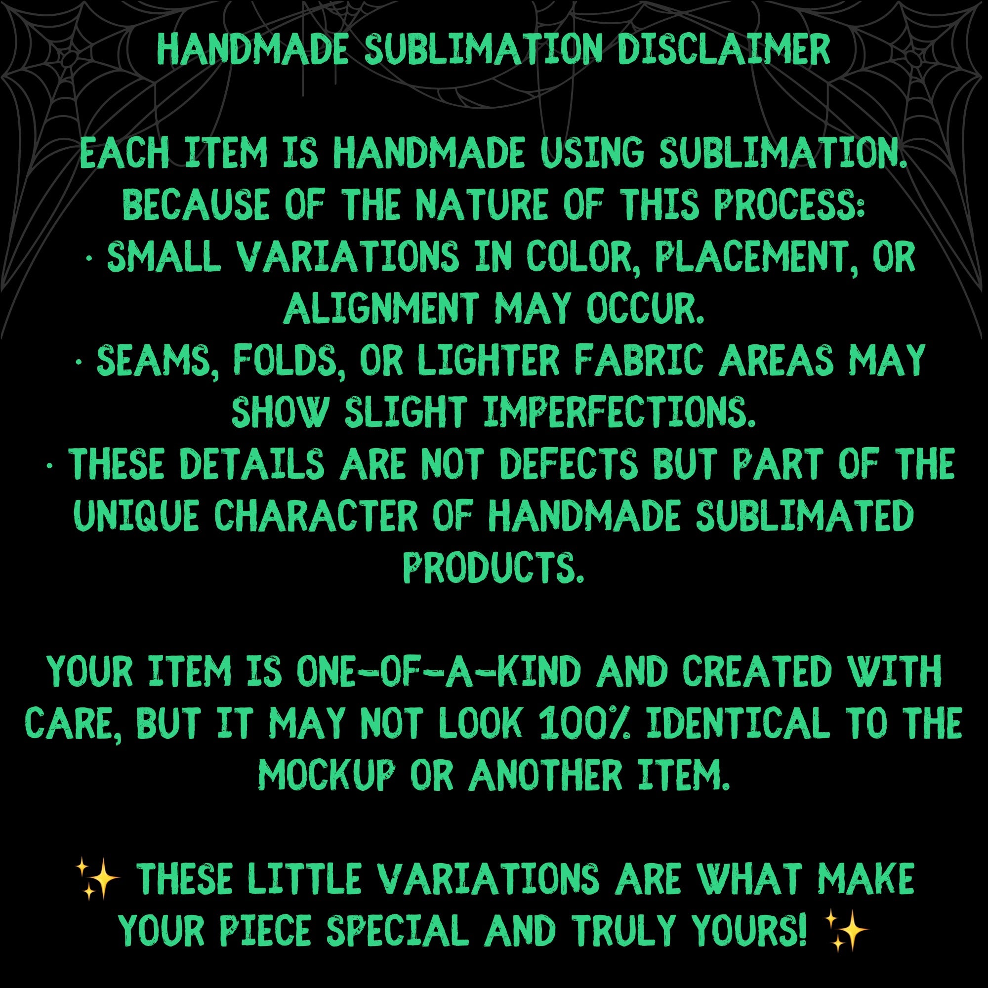 Please note: sublimation is a handmade process, so small variations in color/placement may occur — no two items are exactly alike!