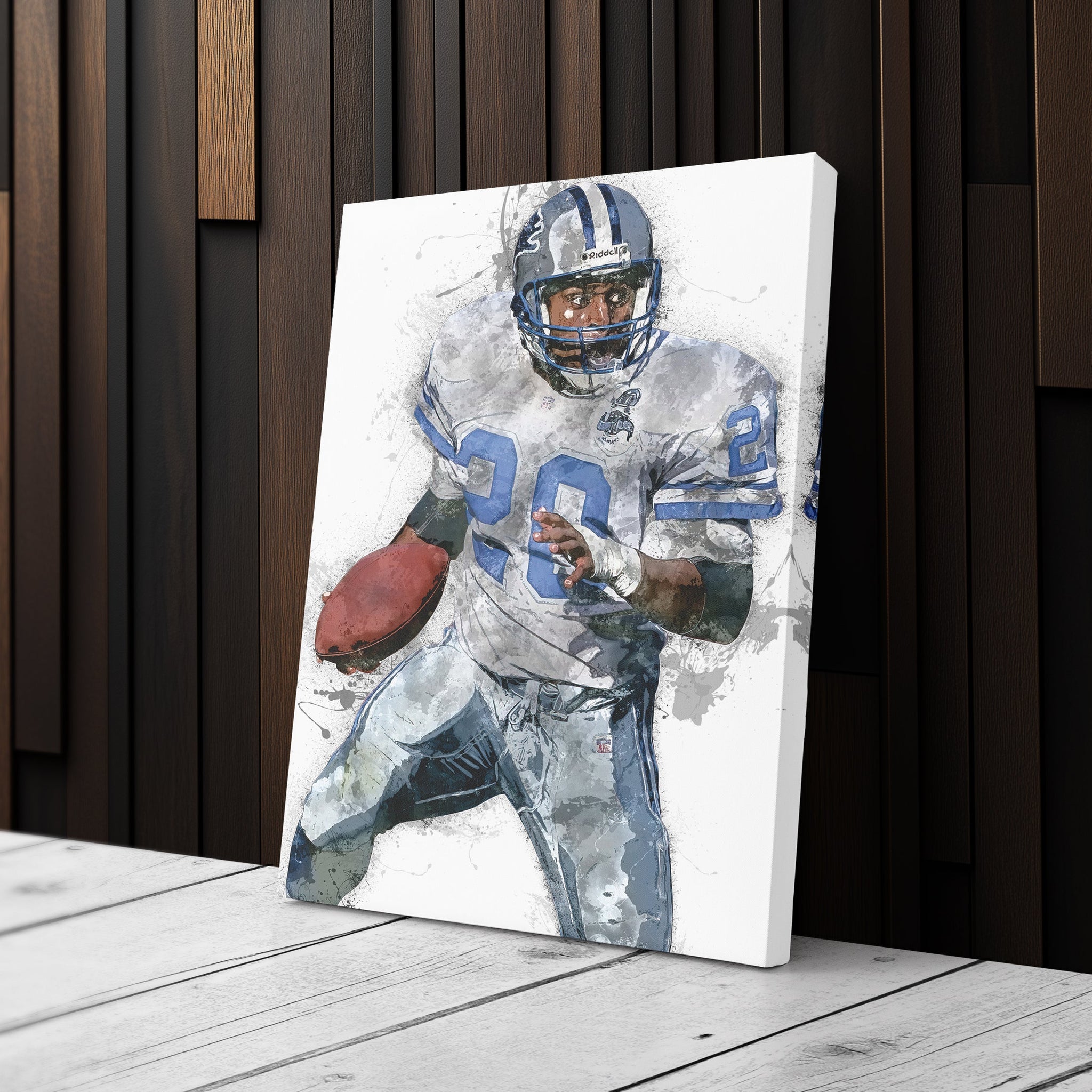 Perfect for Lions fans, NFL collectors, and lovers of football history, this premium canvas print delivers high-definition detail, Detroit blue and silver tones, and the unmistakable energy of #20. Printed on artist-grade canvas, it's built to elevate any space—from man caves to home offices to sports bars.