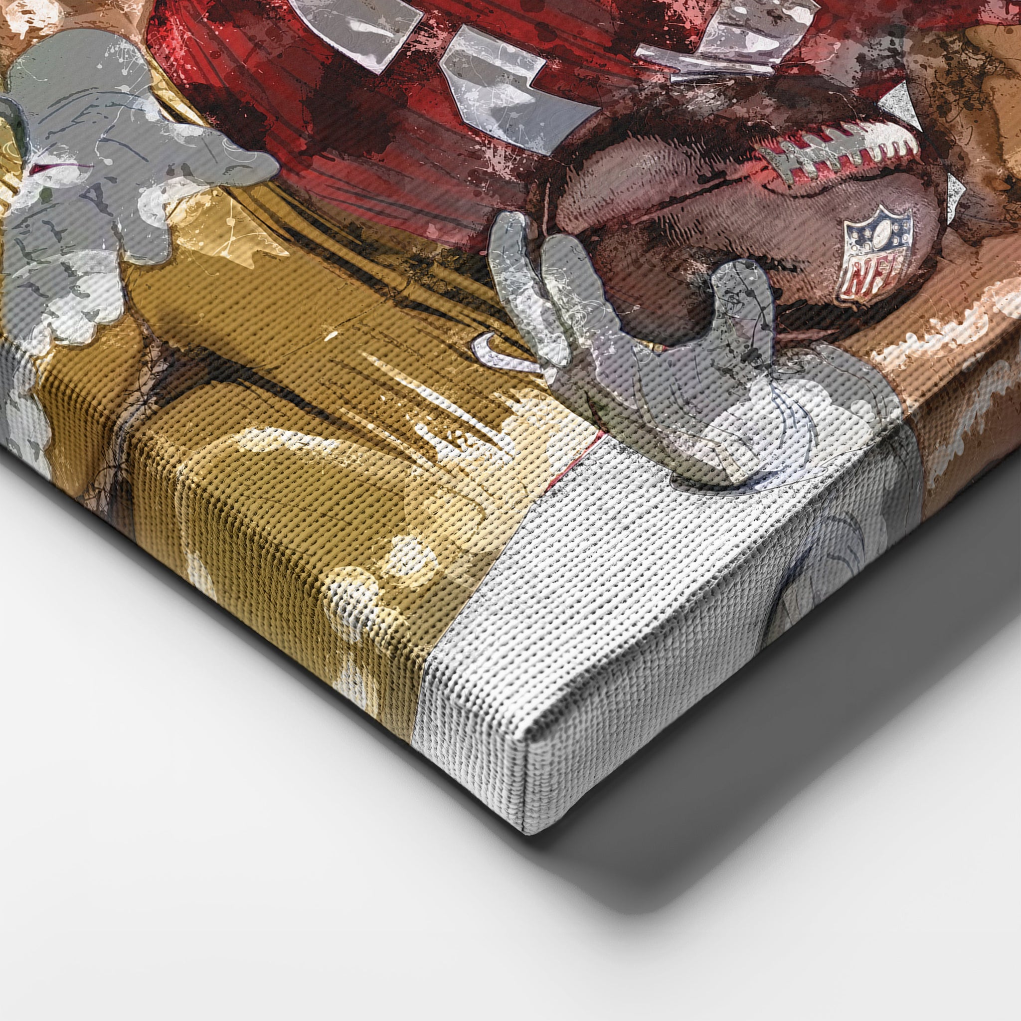 Perfect for 49ers fans, football collectors, and anyone who appreciates elite athleticism, this premium canvas print delivers crisp detail, rich red and gold tones, and an action-packed composition that brings the gridiron to life. Whether for your man cave, office, or sports-themed space, it’s a must-have statement of Niners pride.