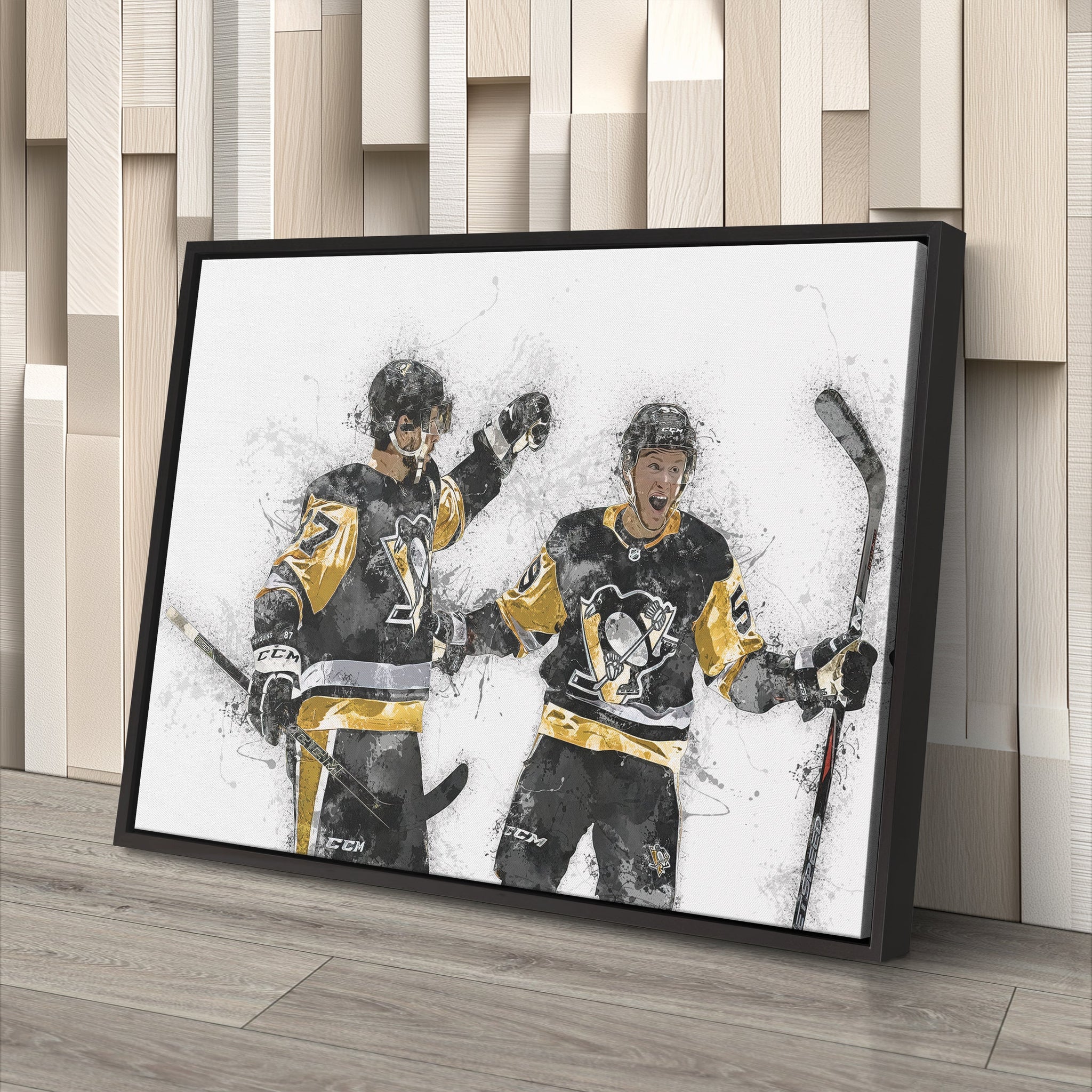 This premium-quality canvas captures both players in action — Crosby threading a perfect pass, Guentzel lighting the lamp, or celebrating a huge goal together — framed in the Penguins’ classic black, gold, and white. Whether displayed in a hockey-themed room, office, or fan cave, this piece brings pride, excitement, and Pittsburgh hockey tradition to your décor.